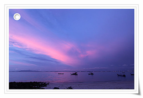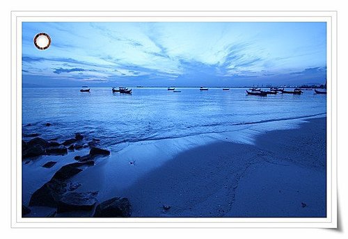 遠處的旅館區,燈火通明,燈光返照在如鏡的海面,沒有風、沒有聲音,彷彿一切忽然都靜止了。