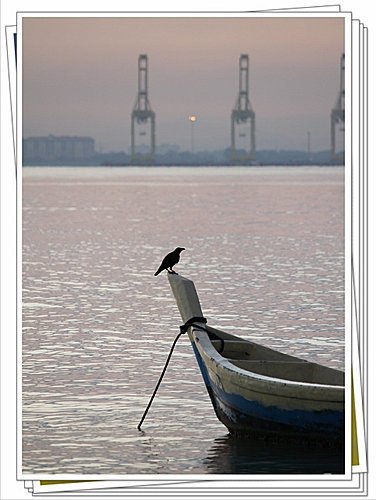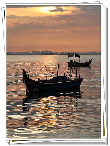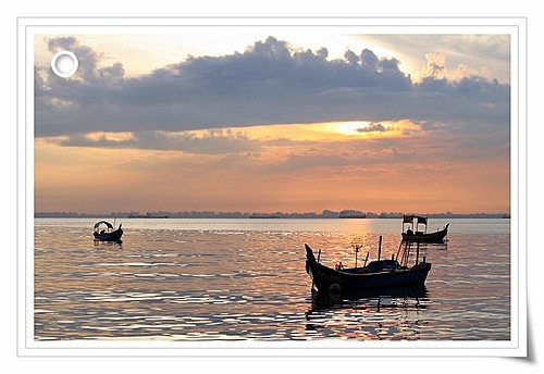 朝陽慵懶地由雲層間探頭,照亮的天際,也染紅了海面;風輕輕地吹皺海水,形成油畫一般的景致。