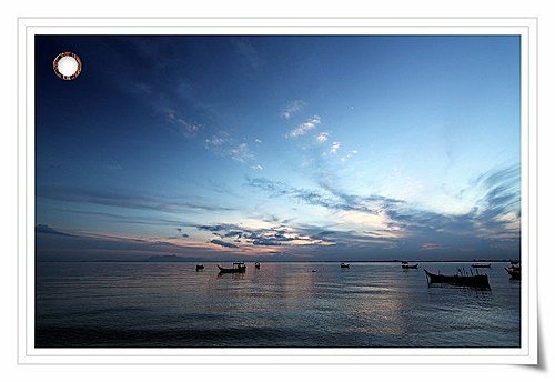 傍晚時分,漁船歸來,夕陽光影透過彩雲將藍色天幕揮灑出瑰麗的畫作,又一點一滴倒映在海平面。