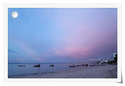 清晨,沙灘空無一人,只有漁家扁舟點點。