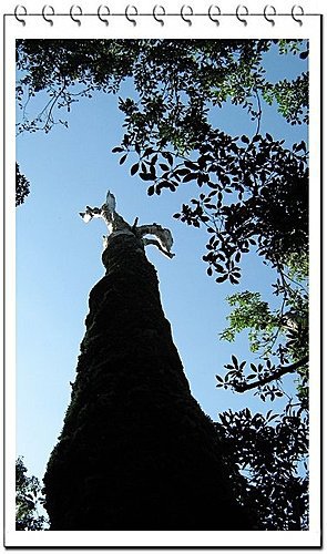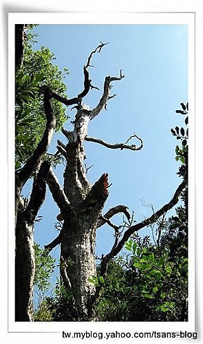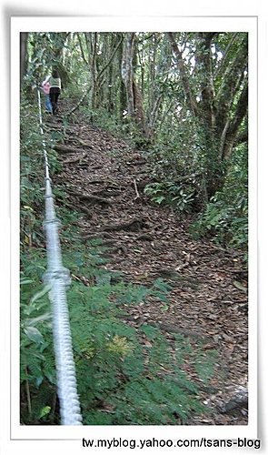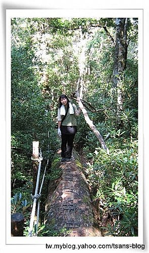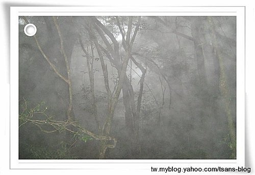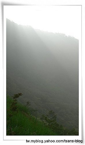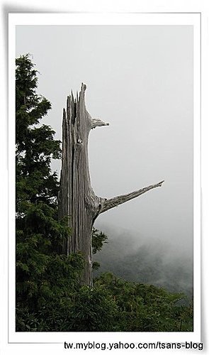 步行至2000公尺處(有天然木椅可供休息),漸入佳境,隨著里程數目的不斷縮減,我們也愈發有精神。到了! 到了!終於到了最高點,再向前行50公尺即是景觀台,唉!又是大霧,一片蒼白,涼風吹著溼透的衣服,提醒我們該早些下山,沿途果真山嵐出現,我們也加速趕回營地。