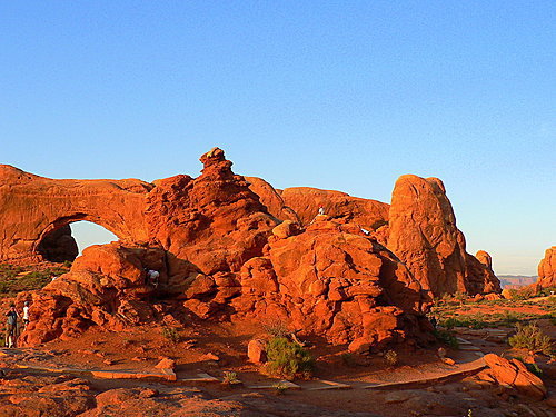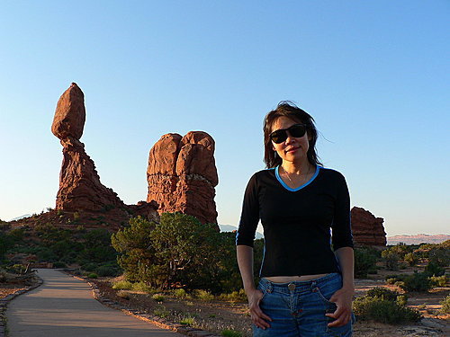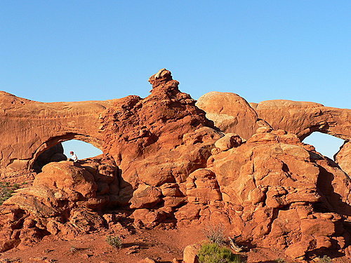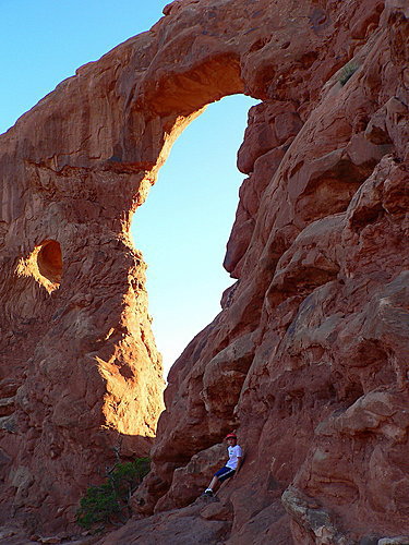 重頭戲結束後,開車繞一繞其他景點像是平衡石、惡魔花園、公園大道、南北窗等,就回KOA營地游泳泡水及洗衣去了,因為中午時分氣溫飆高至華氏100度以上,出去也只能「烤肉」而已,等到下午四點多再進去參觀。這兒太陽下山一般都要八點多左右,所以有四個多小時可以再逛逛。這次重點就放在南北窗了,在這裡等待夕陽。