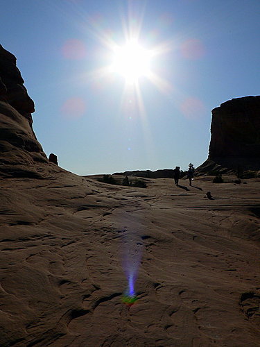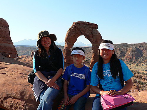 一般人到拱門國家公園,免不了要親身站在那鬼斧神工的拱門下感受一下;可是由停車場到拱門,要走一段單程約50分鐘的步道,沿途幾乎沒有遮蔭,所以九點以後才開始走的話,會是十分辛苦的。我們帶著小朋友在去程幾乎都是上坡的步道邊走邊休息,Gavin像一隻大角羊一樣,全程領先。好不容易才到拱門,一見到他,你一定會覺得辛苦是有代價的。從另一個角度看他,感覺不知何時,這個拱門就快崩塌,不再存在了。