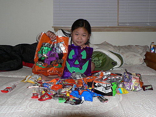 “Trick or Treat”從晚上六點開始,八點結束, 一定要好好把握這兩個小時. 雖然下著小雨, 氣溫接近五度, Joanne and Gavin仍樂此不疲的一起去要糖, 我們則站在人行道上幫他們做苦工---提他們要回來的糖…..超重的, 因為有些屋主給果汁. 非常感謝他們的熱情, 使我們有個畢生難忘的萬聖節….