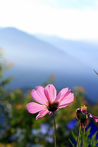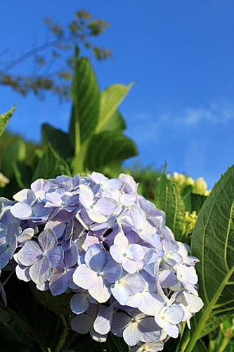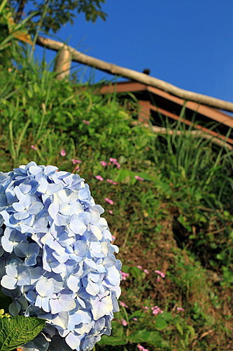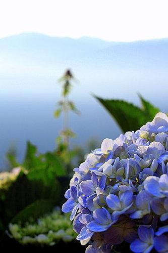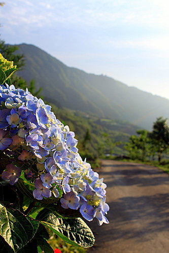 鳥嘴山營地,我們又來了,看看你季節的變化,果然現在又是另一番景緻,繡球花開了,迎著晨曦,盛開的繡球,映著山影,跟著朋友一同欣賞,令人心曠神怡。_